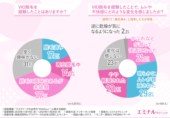 VIO脱毛経験者は約3人に1人。脱毛経験者の約7割が「ムレの軽減を実感」