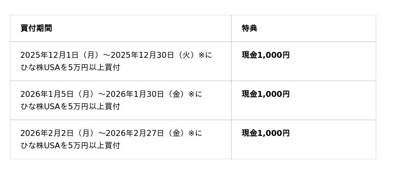 キャンペーン期間中に新規口座開設+エントリーいただいたお客さまがひな株USAを5万円以上買付すると