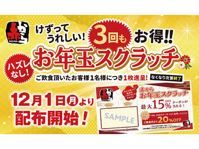 「おいしさと楽しさの創造」を理念に掲げる株式会社甲羅(本社:愛知県豊橋市、代表取締役社長:沼澤 裕)は、全国で約140店舗を展開している「赤から」全店舗にて、2025年12月1日(月)より「赤からお年玉スクラッチ」を今年も配布いたします。ご来店いただくたびに特典が受けられる期間限定の企画となっております。この機会にぜひ「赤から」をご利用ください。