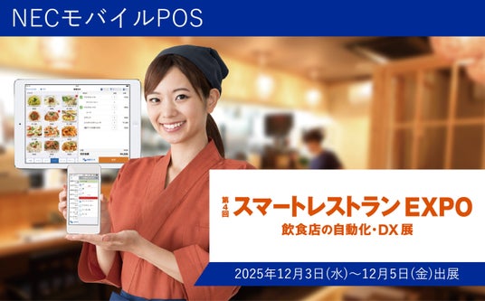 日本電気株式会社(本社:東京都港区、取締役 代表執行役社長 兼 CEO:森田 隆之、以下NEC)は、2025年12月3日(水) ~ 12月5日(金)まで開催される「スマートレストランEXPO2025」(主催:RX Japan株式会社)にサブスクリプション型POSシステム「NECモバイルPOS」を出展します。