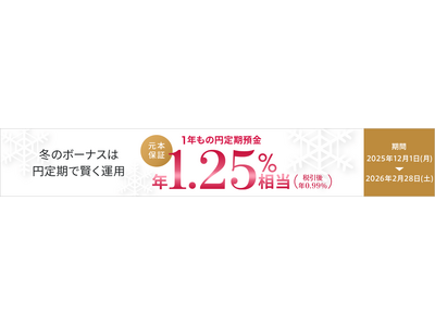 本キャンペーンでは、2025年12月1日(月)から2026年2月28日(土)の期間中にお預け入れされた1年もの円定期預金に対し、通常金利年0.40%(税引後 年0.31%)(注)に【特典1.】年0.65%(税引後 年0.52%)を上乗せした特別金利年1.05%(税引後 年0.83%)を提供します。