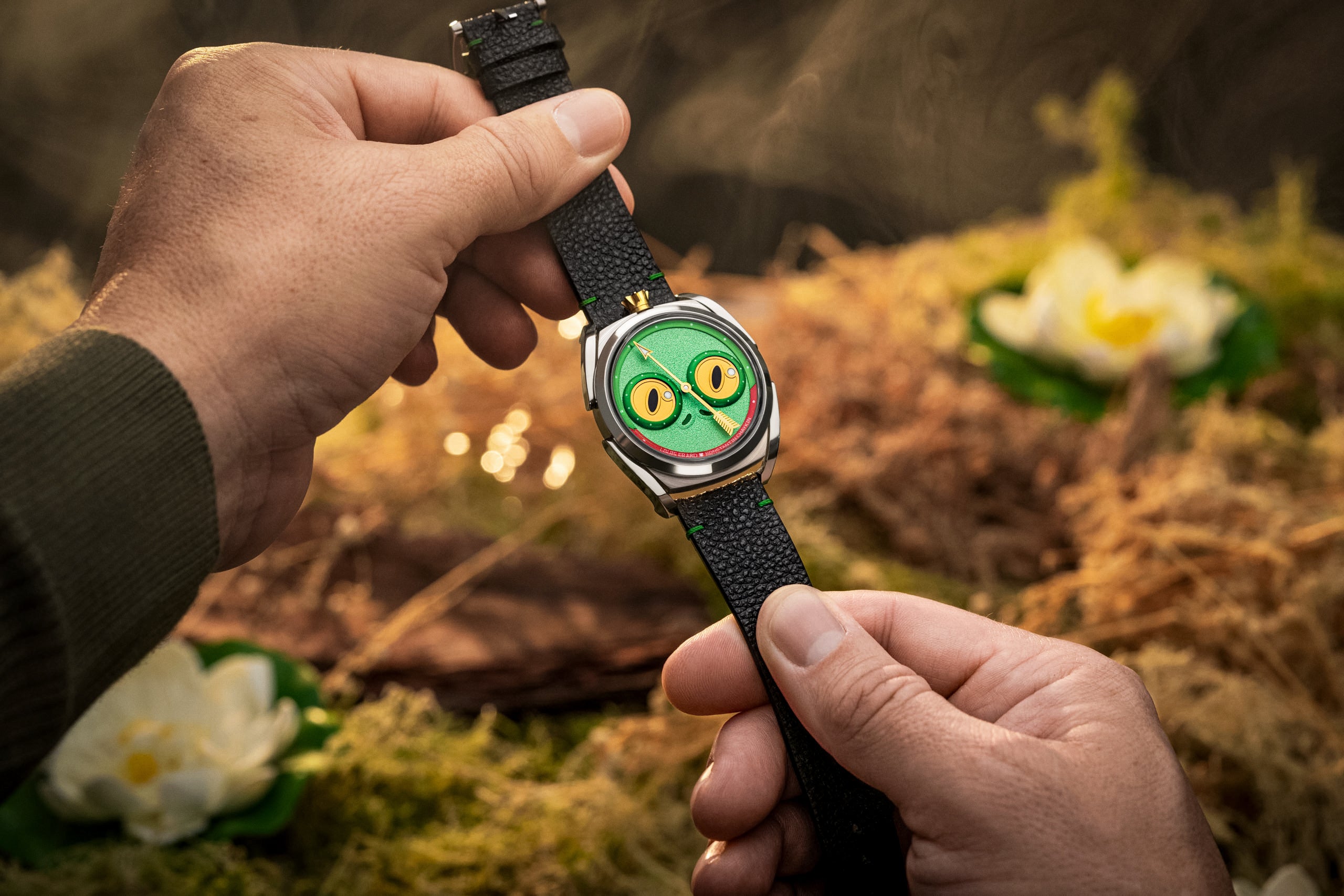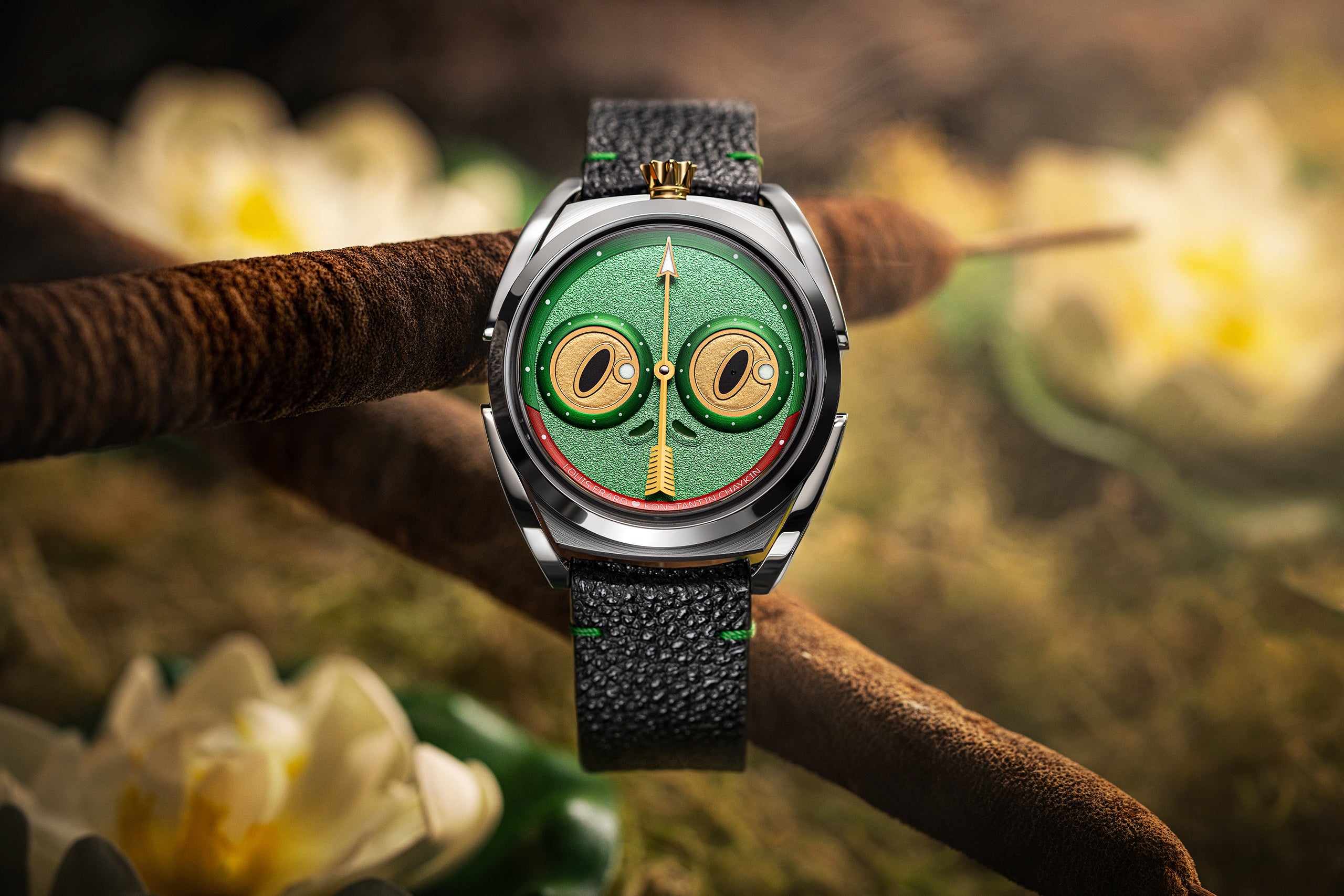 本作は、伝統的なレギュレーター表示を再解釈し、ケースからストラップに至るまで全面的に刷新した、ブランドにとって特別なコラボレーションモデルです。スラヴ神話に登場するカエルのモチーフに、日本の文化要素や素材を組み合わせ、コンセプトから造形まで一貫した世界観で作り上げています。