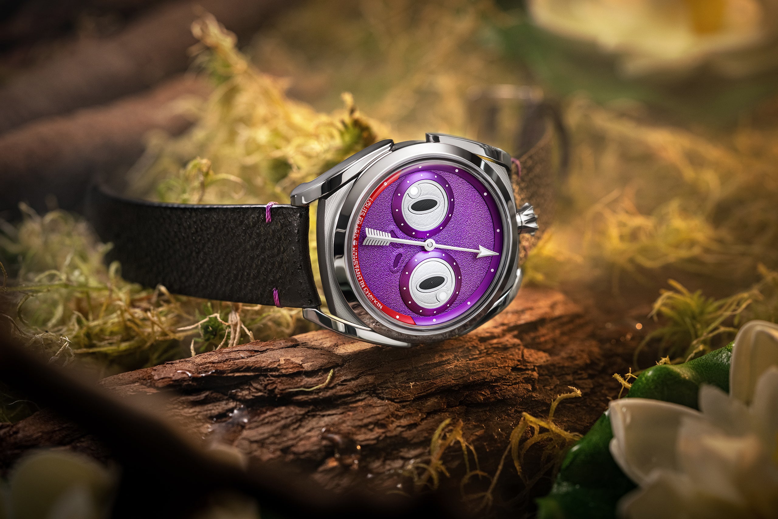 9時位置に時、3時位置に秒を配置し、中央には矢型の分針を採用。回転する眼球のようなディスクにより、ユニークな表情と視認性を両立しています。