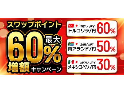 インヴァスト証券株式会社(本社:東京都港区、代表取締役社長:伊藤 誠規、以下「当社」)は、外国為替取引サービス「トライオートFX」において、トルコリラ/円(TRY/JPY)、南アフリカランド/円(ZAR/JPY)、メキシコペソ/円(MXN/JPY)の新規買建玉を対象に、期間中の“建玉増加分”に対してスワップポイントを増額するキャンペーンを2025年12月1日(月)~12月26日(金)まで実施します。