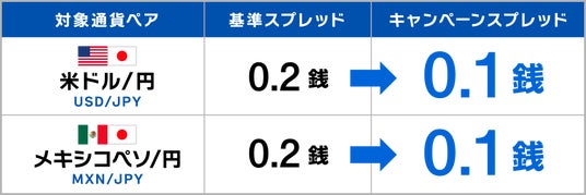 キャンペーン期間中、18時から21時の時間帯において、「米ドル/円(USD/JPY)」および「メキシコペソ/円(MXN/JPY)」のスプレッドを0.2銭から0.1銭※に引き下げます。対象時間帯の新規約定および決済約定は、キャンペーンスプレッドが適用されます。