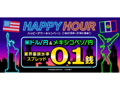 「米ドル/円」「メキシコペソ/円」を対象に毎日18時~21時限定でスプレッドを「0.2銭から0.1銭」に縮小するHAPPYHOURキャンペーンを2025年12月1日(月)~12月19日(金)まで開催いたします。