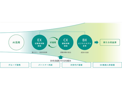 DXビジョンに基づき、働きがいを実感する従業員による質の高いサービスが、お客さまの感動体験を生み、さらに従業員のモチベーションを向上させるようなEXとCXの好循環につなげていきます。積極的なAI活用を起点としたこのサイクルを、グループ連携やパートナー共創、DX推進を支える基盤の強化によって加速させ、ビジネスモデル変革とその先の新たな収益源の獲得を実現することがDXによる価値創造と考えております。