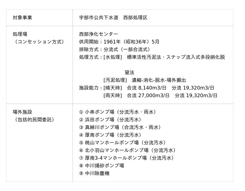 本事業は、宇部市がPFI手法(コンセッション方式)を活用して実施する公民連携(PPP)事業です。宇部市が施設の所有権を保持したまま、うべアクアフロントが「西部浄化センター」の管理・運営を行います。また同社は、同センターの場外施設を包括的民間委託により維持管理も行います。このように本事業は、宇部市西部処理区の下水道施設を一体的に運営・維持管理をするものです。