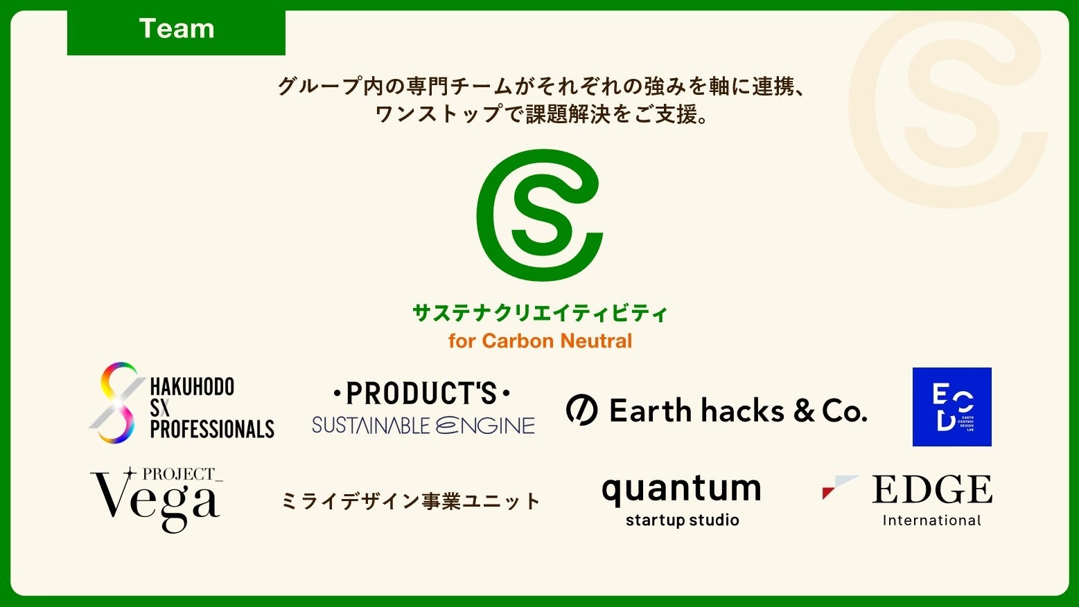 「博報堂SXプロフェッショナルズ」「博報堂プロダクツ サステナブルエンジン」「Earth hacks」「地球中心デザイン研究所」「PROJECT_Vega」「ミライデザイン事業ユニット」「quantum」「エッジ・インターナショナル」など、サステナビリティ領域における各分野の専門性を持つグループ会社および専門組織等が連携し、戦略策定から社会実装まで支援します。