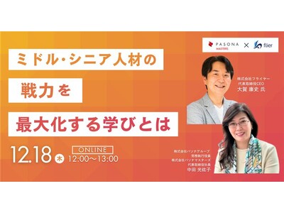 株式会社パソナマスターズ(本社:東京都港区、代表取締役社長 中田光佐子)は、書籍の要約サービスなどを手掛ける株式会社フライヤー(本社:東京都千代田区、代表取締役CEO 大賀康史)とともに、人事・研修部門のご担当者様へ向けたウェビナー「ミドル・シニア人材の戦力を最大化する学びとは」を12月18日(木)に開催いたします。