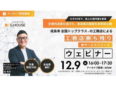 株式会社Gハウス(所在地:大阪府大阪市旭区、代表取締役社長:趙 晃啓)は、2025年12月9日(火)に自社ウェビナーを開催いたします。本ウェビナーでは、現代表の就任からわずか5年で売上43億円増を実現し、全国トップクラスの成長率*を達成したその背景と新たに展開するサービスを業界関係者の皆さまに向けて限定公開いたします。