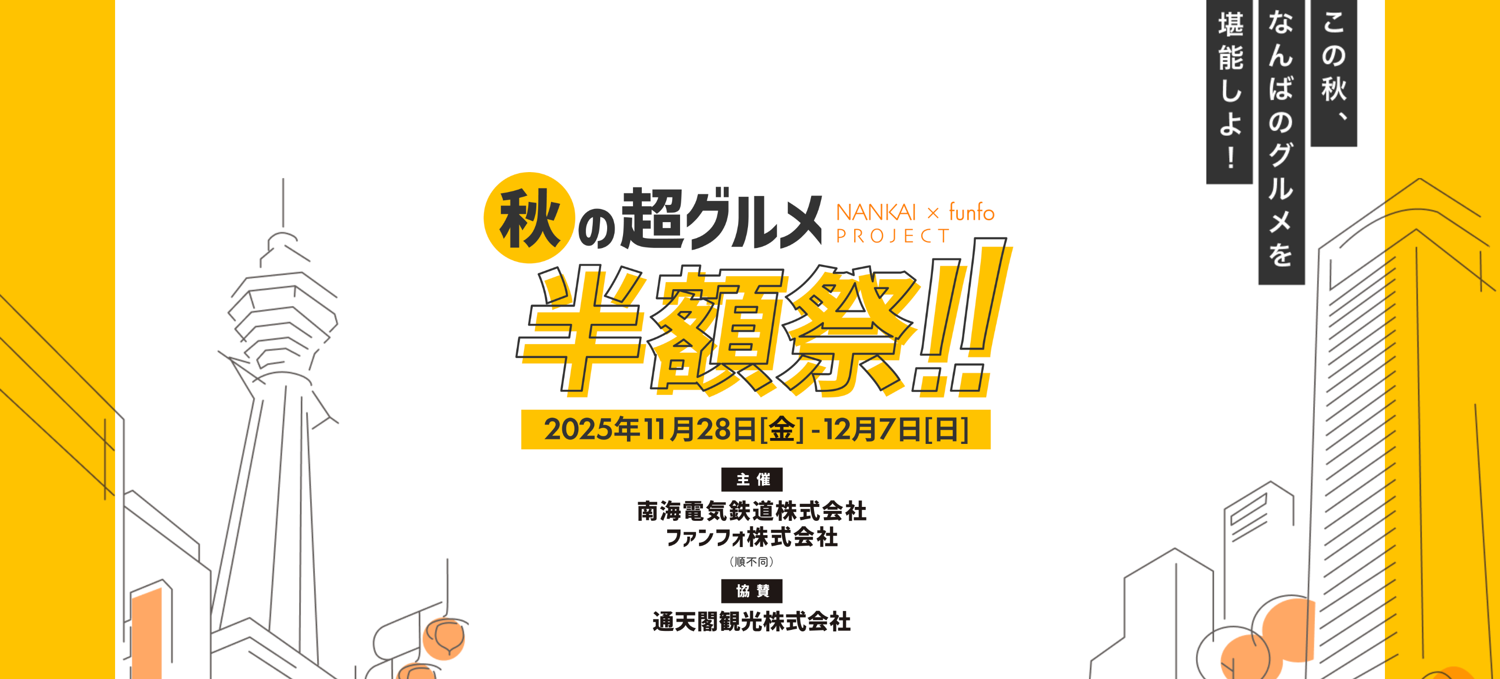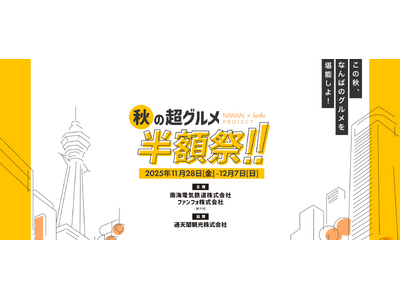 ファンフォ株式会社(本社:京都府京都市下京区、代表取締役:喬 恒越、以下「ファンフォ」)は、南海電気鉄道株式会社(本社:大阪府大阪市浪速区、代表取締役社長:岡嶋 信行、以下「南海」)と共同で、「秋の超グルメ半額祭」をなんばCITY・なんばパークスを中心に実施いたします。