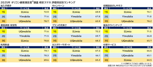 『格安スマホ』評価項目別ランキング(2025年 オリコン顧客満足度(R)調査)