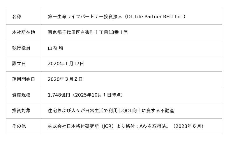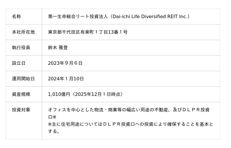 本投資法人は、第一生命保険株式会社(代表取締役社長:隅野 俊亮、以下「第一生命」)、株式会社第一ビルディング(代表取締役社長:櫻井 謙二、以下「第一ビル」)、および相互住宅株式会社(代表取締役社長:武富 正夫、以下「相互住宅」)というスポンサー各社からのサポートを受け、オフィスビル・物流施設・商業施設等の幅広いセクターの不動産に加え、第一生命リアルティが運用している住宅・QOL向上アセット(※1)を投資対象とする特化型私募リート「第一生命ライフパートナー投資法人」(以下「DLPR」)の投資口も投資対象に組み入れるスキームを採用し、2024年1月より運用を開始しました。