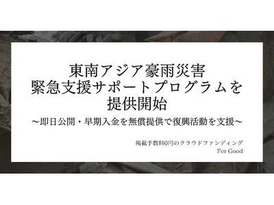 株式会社ボーダレス・ジャパン(代表取締役:田口一成/本社:福岡県福岡市)が運営するソーシャルグッドに特化したクラウドファンディングサービス「For Good」(事業代表:小松 航大)では、2025年11月、タイ、マレーシア、フィリピン、スリランカなどの東南アジア各地で相次いで発生した記録的な豪雨により被害を受けた方々を支援するため、緊急支援に取り組む非営利団体・企業・個人向けにクラウドファンディング緊急支援サポートプログラムの提供を開始します。