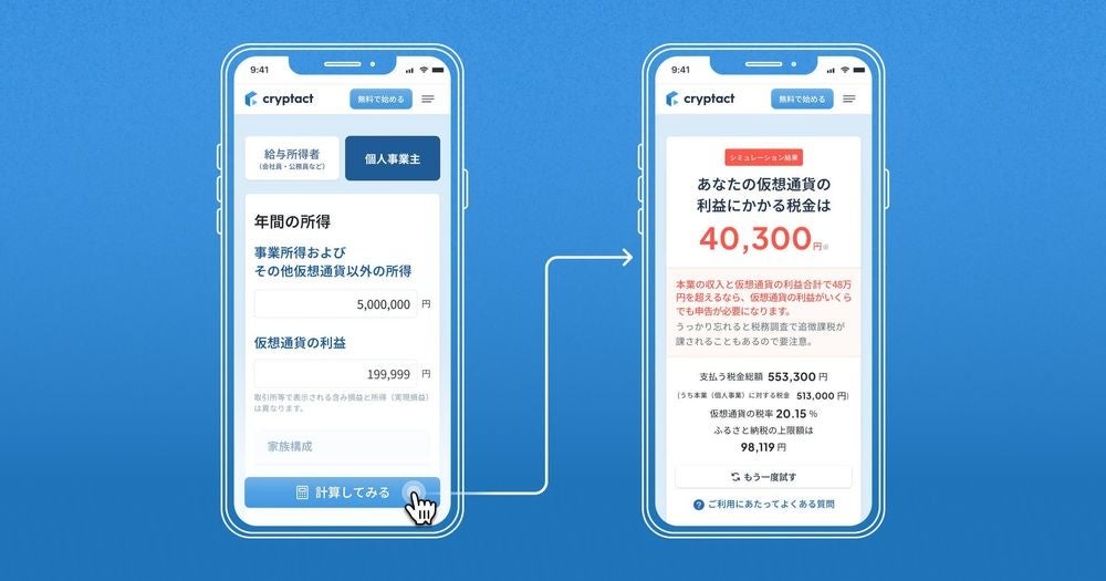 さらに、暗号資産損益計算ツール「クリプタクト」と組み合わせることで、取引データをもとに実現損益を効率的に算定し、その結果を用いて本ツールで正確な納税額を計算することができます。これにより、納税額の見通しを立てながら、計画的に資産管理と確定申告を行えるようになります。