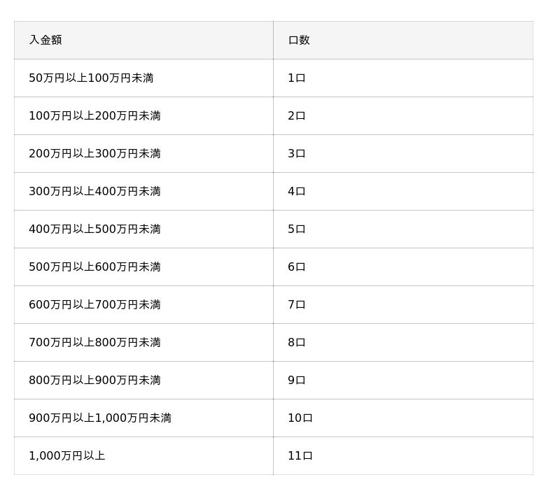 ・キャンペーン期間中、何回でもご入金いただくことが可能です。キャンペーン期間内の入金額合計に応じて抽選口数がアップします。