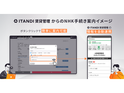 本機能により入居者がNHKの受信契約・住所変更の手続きを希望した際には、入居申込時に「ITANDI 賃貸管理」に入力した氏名や連絡先などの情報をそのままNHKの受信契約・住所変更の手続きサイト(NHK「受信料の窓口」)に引き継ぎ、オンラインでのスムーズな手続きが可能になります。