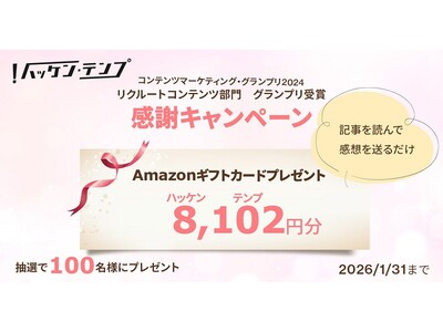 本キャンペーンでは、『ハッケン・テンプ』の記事を読んで感想を送っていただいた方の中から抽選で100名様に、“8,102(ハッケン・テンプ)円”のAmazonギフトカードをプレゼントします。どなたでもご応募いただけますので、ぜひご応募ください。