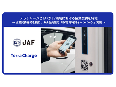 電気自動車(EV)向け充電サービス「Terra Charge(テラチャージ)」を提供するTerra Charge株式会社(本社:東京都港区、代表取締役:徳重 徹、以下「当社」)は、一般社団法人日本自動車連盟(JAF、会長:坂口正芳)とEV充電インフラの拡充およびサービス利便性向上を目的とした協業契約を締結し、2025年12月1日(月)より JAF会員限定「EV充電特別キャンペーン」を実施します。