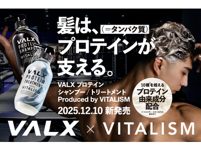 「VITALISM(バイタリズム)」 を展開する株式会社ヘアジニアス・ラボラトリーズ(本社:東京都渋谷区、代表取締役:津田知明)は、このたび、 日本を代表するプロテインブランド「VALX(バルクス)」を展開するVALX株式会社(本社:東京都渋谷区、代表取締役 只石昌幸)とのコラボレーションを実現。新たに、プロテインの力をヘアケアに活かした「VALX プロテインシャンプー」「VALX プロテイントリートメント」をリリース。2025年12月より、販売を開始します。