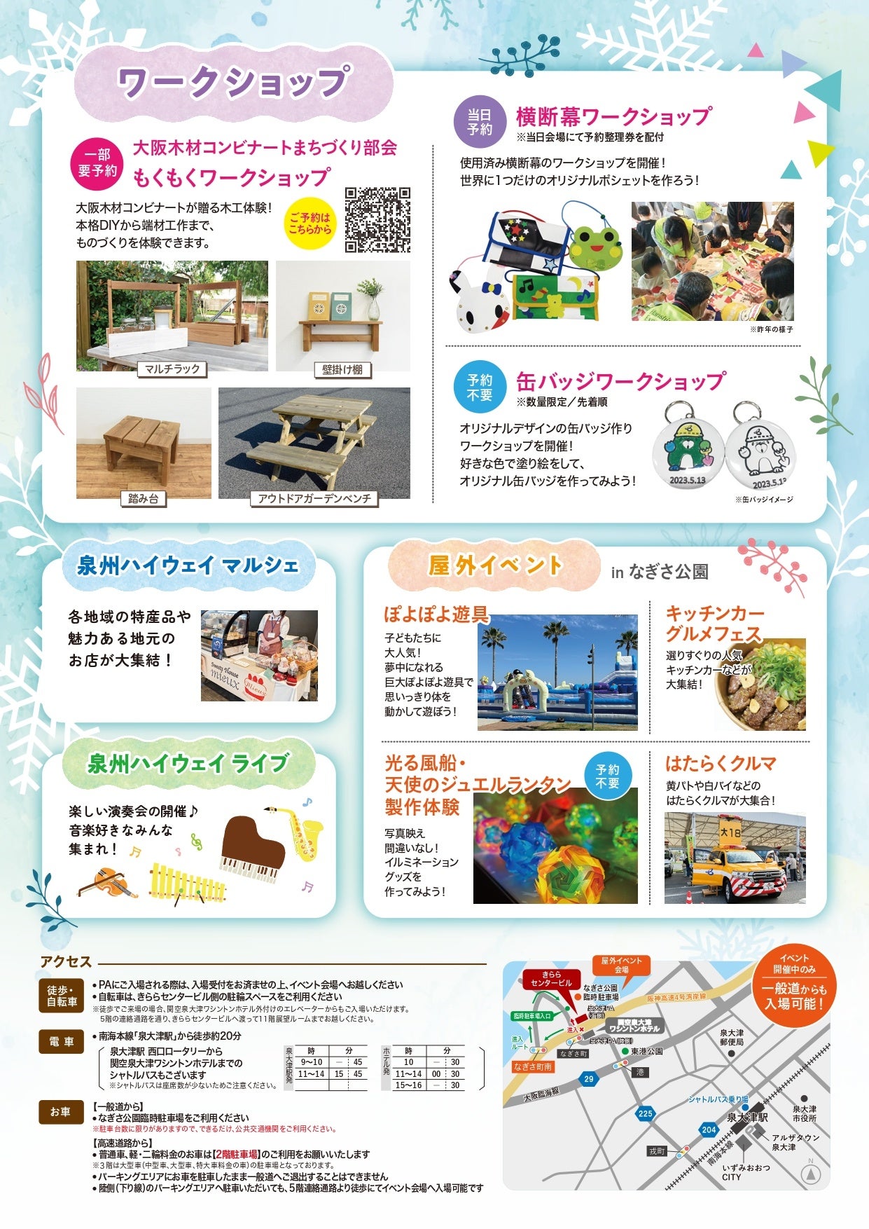 各地域の特産品や魅力ある地元のお店が大集結した"泉州ハイウェイマルシェ"をはじめ、各地域のゆるキャラ交流や、各種ワークショップ、泉州ハイウェイライブ(演奏会)等も開催いたします!