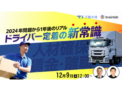 株式会社ブレイン・ラボ(本社:東京都港区、代表取締役社長:中江典博)は、キャムコムグループの株式会社天職市場(本社:東京都新宿区、代表取締役:春名敬太 )と2025年12月9日(火) 12:00より、オンラインセミナー『【物流・運送業界向け】2024年問題から1年後のリアルと、ドライバー定着の新常識』を共同開催いたします。