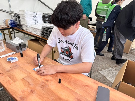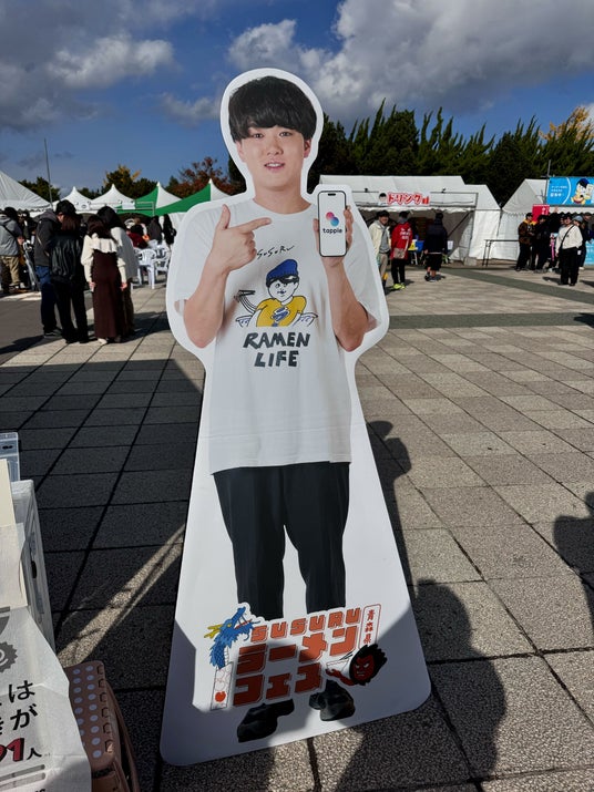 株式会社タップルは、SUSURUの等身大パネルの設置とあわせて、思い切りラーメンをすすっても安心な紙エプロンの配布を実施。多くの来場者が等身大のSUSURUと記念撮影を楽しむ様子が見られました。