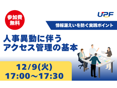 リスクマネジメント分野のコンサルティングサービスを提供する株式会社UPF(本社:東京都中央区、代表取締役:仲手川 啓、以下当社)は、2025年12月9日(火)17:00より、人事異動時のアクセス権限管理におけるリスクと実務対応を解説する無料オンラインセミナーを開催いたします。