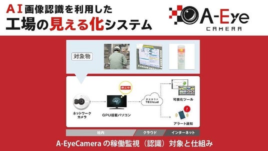 AIで「ヒト・キカイ」もまるごと見える化ネットワークカメラで撮影した画像を元にAI(人工知能)が生産設備の稼働状況を判断し、クラウドに情報を蓄積するIoTシステム。 蓄積した情報をリアルタイムに集計・分析し、稼働状況を共有することで「工場の見える化」を推進します。