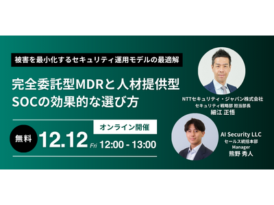 NTTセキュリティ・ジャパン株式会社(本社:東京都千代田区、代表取締役社長:関根 太郎)は、2025年12月12日(金)にAIセキュリティ合同会社(本社:東京都新宿区、代表取締役:堀居 隆生)と、「被害を最小化するセキュリティ運用モデルの最適解 -完全委託型MDRと人材提供型SOCの効果的な選び方-」セミナーを共同開催します。