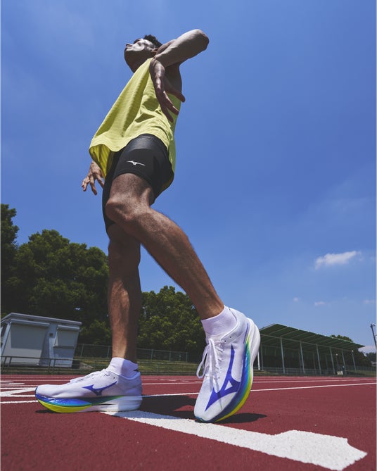 「軽いだけではない」軽量性・反発性・安定性の三位一体を実現した「HYPERWARP」シリーズは、ミズノが提案する新たなスピードランナー向けレーシングシューズです。