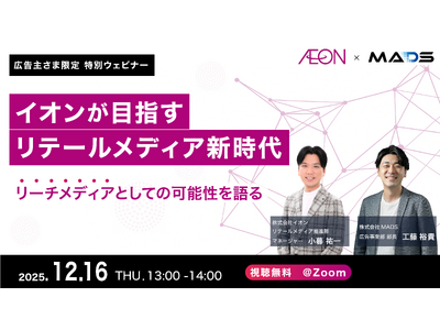 株式会社MADS(本社:東京都、代表取締役CEO:穴原 誠一郎)は、イオン株式会社(本社:千葉県、取締役 代表執行役社長:吉田 昭夫)のリテールメディア推進部 マネージャー 小暮祐一 氏をゲストに迎え、2025年12月16日(火)13:00~14:00に共催ウェビナー「イオンが目指すリテールメディア新時代──“リーチメディア”としての可能性を語る」を開催します。
