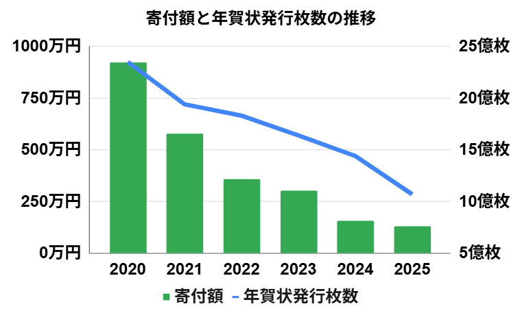 ハガキ・切手の寄付も大幅に減少し、2020年から2025年にかけて