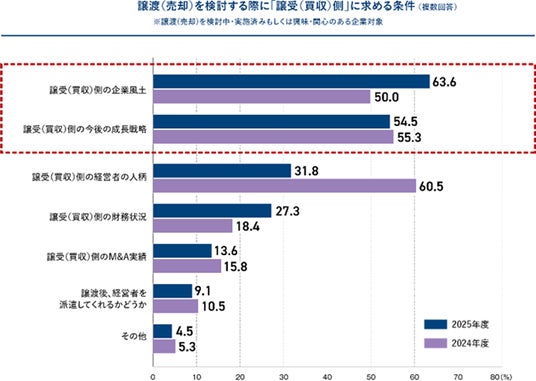 譲受側に求める条件としては、「企業風土」(63.6%)と「今後の成長戦略」(54.5%)が過半数を占める結果となりました。前年と比較すると「企業風土」は13ポイント以上上昇しており、企業文化的な親和性を重視する傾向が高まっていることが分かります。一方で、「経営者の人柄」(31.8%)は大きく減少しており、属人的な要素から組織全体の将来性や企業文化的な相性へと評価基準がシフトしている様子がうかがえます。