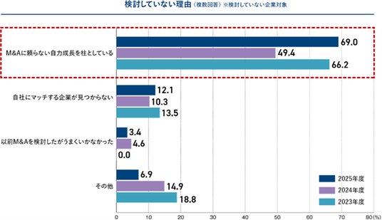 M&Aを検討していない理由として、「M&Aに頼らない自力成長を柱としている」と回答した企業が69.0%に達し、過去3年間で最も高い割合となりました。前年の49.4%から大きく上昇しており、企業の多くがM&Aを選択肢に含めつつも、自力成長(オーガニック成長)を優先する姿勢を示している企業も一定数いることが分かります。