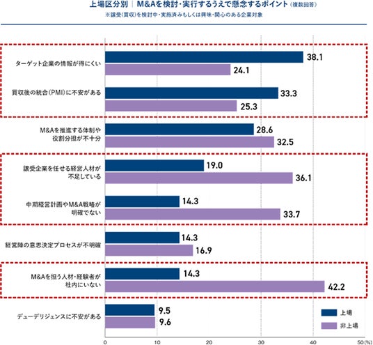 (7)M&Aを検討する上での懸念点、上場企業は「情報不足」、非上場企業は社内の「経験者不足」。