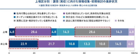 譲受(買収)に向けた検討状況では、上場企業では「実際に交渉・検討を行っている案件がある」(28.6%)や「社内で検討はしているが、具体的な対象は未定」(28.6%)が中心となりました。一方、非上場企業では「社内で関心はあるが、何も着手していない」(22.9%)が比較的多く、上場企業に比べて初期段階にとどまる割合が高くなっています。