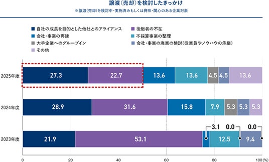 (2) 譲渡(売却)検討理由では、かつて過半数を占めていた「後継者不在」が半減し、「自社の成長を目的とした他社とのアライアンス」「会社・事業の再建」などを目的とした多様な理由が上位に並ぶ構図へと変化していることが分かりました。