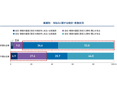 業績が好調な企業では、「会社・事業の譲受(買収)」について「検討・実施」(34.6%)や「関心あり」(53.8%)が突出し、成長を加速させる手段として譲受を志向している結果となりました。一方、業績が不調な企業では「譲渡(売却)」について「検討・実施」(6.9%)や「関心あり」(27.6%)が相対的に高く、再編や撤退を視野に入れていることがうかがえます。業績状況によって、M&Aの方向性が大きく分かれる実態が明らかとなりました。