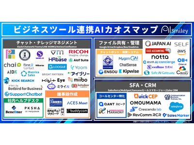 国内最大級のAIポータルメディア「AIsmiley」を運営する株式会社アイスマイリー(東京都渋谷区、代表取締役:板羽 晃司)は、既存のビジネスツール(チャット、ファイル管理、SFAなど)と連携し、業務効率化に役立つAIソリューションを厳選した「ビジネスツール連携AIカオスマップ」を、2025年12月2日(火)に公開しました。掲載総数は101製品です。カオスマップを資料請求する■ビジネスツール連携AIカオスマップとは?企業の生産性向上において、情報が複数のツールに散在する「情報のサイロ化」が課題となっています。本カオスマップは、この課題を解決するため「ツール連携による生産性向上」に焦点を当て、企業が日常的に使用する以下の3つの主要なツールカテゴリー、および具体的な利用シーンに特化した製品カテゴリーでAIソリューションを整理しました。- チャット/ナレッジマネジメントSlack、Chatwork、Teams、LINE WORKS、Notion、Confluence- ファイル共有・管理Google Drive、Dropbox、Box、OneDrive- SFA/CRMSalesforce、HubSpot、Sansan、eセールスマネージャー、Zoho CRM資料請求いただいた方には、カオスマップに加え、「ビジネスツール連携AIサービス提供企業リスト(Excel)」を無償でご提供いたします。このリストは、製品名や製品URLに加え、以下の主要ツールとの連携対応状況をチェック形式で記載しています。 ビジネスツール連携AIサービス提供企業リスト(Excel)■ビジネスツール連携AIカオスマップ作成の背景近年、多くの企業で「情報が複数のツールに散在し、必要なデータにたどり着けない」「営業やサポート担当者がデータ入力・記録作業に時間を割かれ、本来のコア業務に集中できない」といった「情報のサイロ化」に起因する複雑な経営課題が顕在化しています。その解決策として、生成AI技術の進化による、AIサービスやAIエージェントの導入が現場レベルで急速に広がりを見せています。これらのAIは、単なる自動化にとどまらず、チャットツールからSFAデータへのアクセスや、ファイルサーバーのナレッジを活かした自動応答を可能にするなど、業務のバリューチェーン全体にわたる情報連携を強化します。実際に、高度な分析・最適化技術がSaaSとして提供され、現在では幅広い事業者へ浸透しつつあります。本カオスマップでは、企業の競争力強化や業務効率化に寄与する最新のAIソリューションを、既存のビジネスツールとの連携可否という観点から、以下の3つの主要領域に整理しています。- チャット/ナレッジマネジメントコミュニケーションの場でAIがナレッジ活用と記録を自動化し、情報共有を強化します。【社内ヘルプデスク特化】:従業員からの問い合わせに対し、AIがチャットサービスやナレッジベースから最適な回答を自動生成。バックオフィスの問い合わせ対応工数を削減します。【議事録作成】:会議中の音声を高精度でテキスト化・要約し、アクションアイテムを特定。チャットサービスやナレッジベースへの自動記録・連携などを実現します。- ファイル共有・管理企業に蓄積された膨大なファイルやドキュメントを、AIが「使える知識」へと変換します。【チャットボット・検索システム】:各種ビジネスツールに格納されたマニュアルや技術資料の内容を学習。AIがチャット形式で質問に回答することで、必要な情報へのアクセス時間を短縮します。- SFA/CRM営業・カスタマーサポートのプロセスにAIを組み込み、データ入力と顧客対応を高度化します。【コールセンター特化】:顧客との通話内容をリアルタイムで分析し、オペレーターを支援。通話後の内容を自動で要約し、SFA/CRMシステムへの入力作業を自動化します。■ビジネスツール連携AIカオスマップの入手方法「大サイズのカオスマップ」と「ビジネスツール連携AIサービス提供企業リスト(Excel)」をお求めの企業ご担当者様は、下記の手順に沿って資料請求ください。- 下記『カオスマップと企業リストを資料請求する』をクリックします。- お問い合わせフォームへ移動後、必要項目を入力の上、送信ください。- 入力されたメールアドレス宛にお問い合わせ受付確認メールが自動送信されます。- 弊社担当者よりメールにてカオスマップをご案内させていただきます。カオスマップと企業リストを資料請求する※本資料はAIの導入を検討している企業に対して配布しております。AIソリューション提供会社の市場調査および同業他社・競合他社への提供はしておりませんので、あしからずご了承ください。※本資料はプレスリリースや製品サイト、導入実績などの公開情報を基にAIsmiley編集部が独自の視点で取りまとめたもので、網羅性や正確性を完全に担保するものではありません。■AIポータルメディア「AIsmiley」の概要AIsmileyは、月間300万PV・掲載製品数500以上を誇る国内最大級のAIポータルメディアです。Webサイト上で気になる技術や業種・業態の事例からAIソリューションを選び、まとめて無料で資料請求できます。企業のAI導入を加速させるプラット