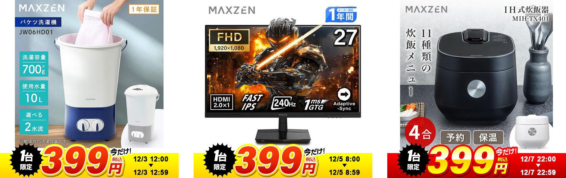 1.MAXZEN バケツ洗濯機 2.MAXZEN ゲーミングモニター 3.MAXZEN IH炊飯器