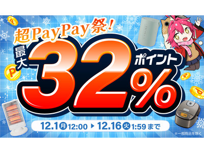 エクスプライス株式会社(本社 東京都江東区、代表取締役社長 清水 敏光)は、2025年12月1日(月)~12月16日(火)に開催の超PayPay祭にて、Yahoo!店の自社3店舗において時間限定ポイント5%や日替わり399円セール、先着クーポンの配布など様々なイベントを開催いたします。