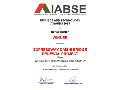 IHIの100%子会社である株式会社IHIインフラシステム(本社:大阪府堺市、代表取締役社長:井上学)が設計・施工に携わった「高速大師橋更新事業」が、世界的に優れた構造物に授与されるIABSE AWARDS 2025 (*1)の作品賞である「Projects and Technology Awards」において、「Rehabilitation(改修・再生)」部門の最優秀作品に選ばれました。日本企業による設計・施工としては初の快挙となります。2025年11月14日(金)に、チューリッヒ(スイス)で開催された授賞式で表彰されました。