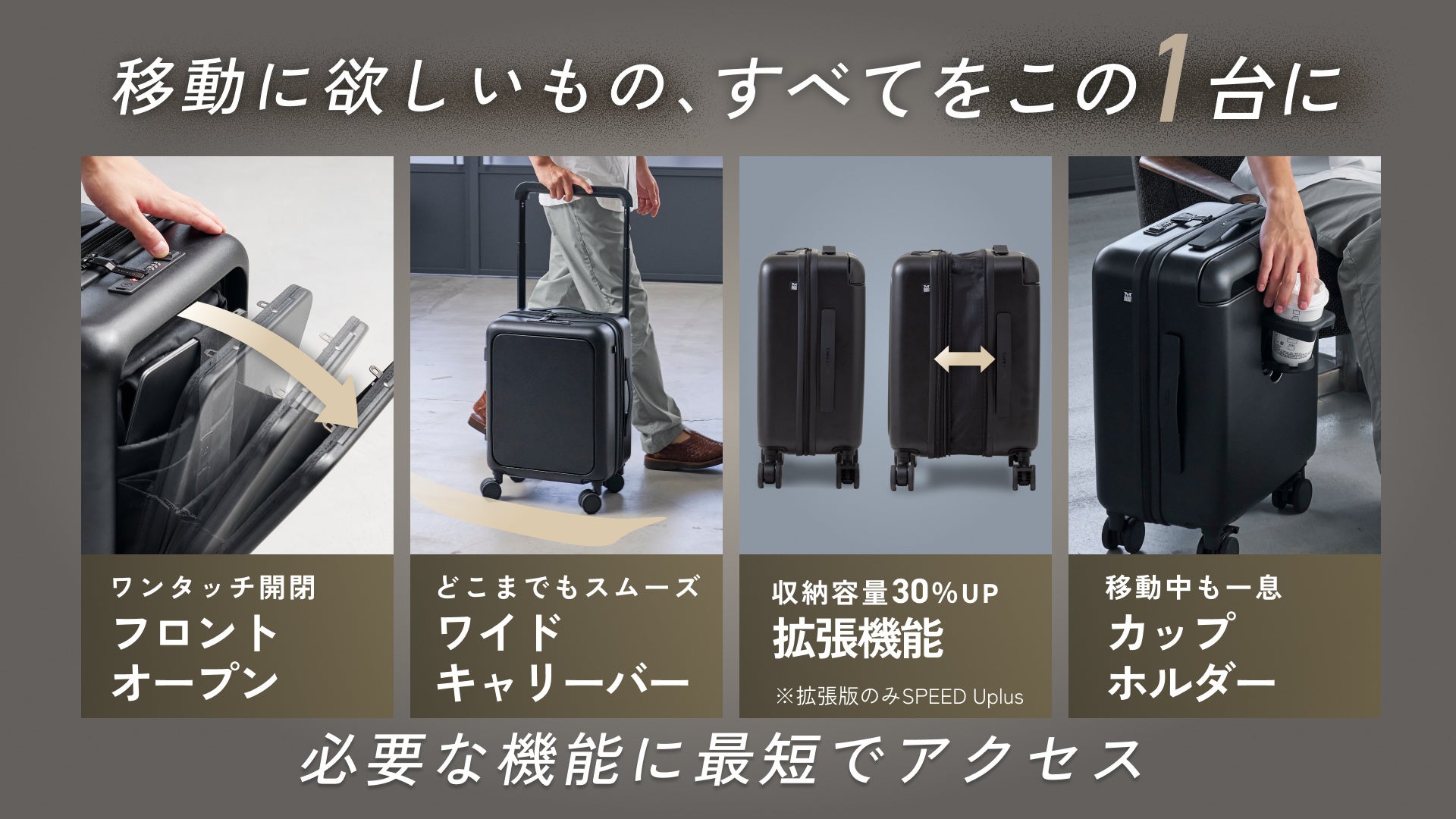 をテーマに新モデルを企画しました。フロントオープンで取り出しやすい「SPEED U」、約30%拡張で荷物の増減に対応する「SPEED U plus」。どちらもビジネスから旅行まで幅広いシーンで快適に使え、移動の“スピード”と“便利さ”を両立しています。