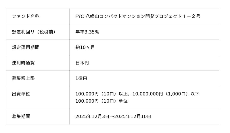 「未来をわかちあう投資」を提供する「Funvest(ファンベスト)」(以下、Funvest)は、「FYC 八幡山コンパクトマンション開発プロジェクト1-2号」(以下、本ファンド)の募集を12/3より開始しますので、お知らせいたします。