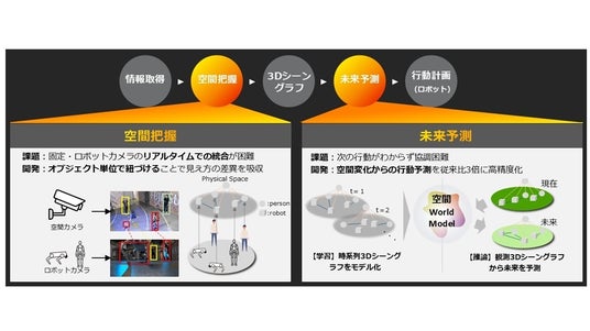 しかし、現在のPhysical AIは、通路が規定された製造現場や物流倉庫など整備された環境での活用が中心で、人が生活する住宅やオフィスでは、人の動きが予測困難で物の配置も頻繁に変化するため空間の状況把握が難しく、適応が困難という課題があります。また、多数の人やロボットが共存する環境では、他者がどう動くのか次の行動を予測できず、協調動作を実現することが難しいのが現状です。