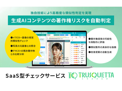 生成AI技術の急速な普及により、企業や個人が簡単にコンテンツを制作できるようになった一方で、既存の著作物との類似性や権利侵害のリスクが課題となっています。特に商用利用においては、意図せず著作権を侵害してしまうリスクが、多くの企業やクリエイターの懸念事項となっていました。このような状況を受け、当社は生成AIコンテンツの安全な活用を支援するため、著作権リスクを事前に検証できる機能をSaaS型サービス「トラスクエタ」に実装いたしました。