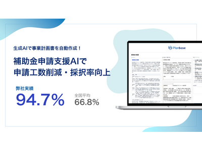 株式会社プランベース(本社:東京都新宿区、代表取締役:武衣 貴志)は、生成AIを組み込んだ自社開発アプリケーション「AI補助金コンサルくん」により、3次省力化投資補助金(一般型)において採択率94.7%(全国平均66.8%)を達成しました。