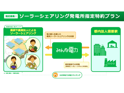 社会課題をオモシロく解決する企業、株式会社UPDATER(所在地:東京都世田谷区、代表取締役:大石英司)が運営する脱炭素ソリューションサービス「みんな電力」は、東京都内の法人需要家向けに、新規で建設される営農型太陽光(ソーラーシェアリング)発電所の電気を長期固定価格で購入できる特約プラン「ソーラーシェアリング発電所指定特約プラン」を2026年4月からスタートします。